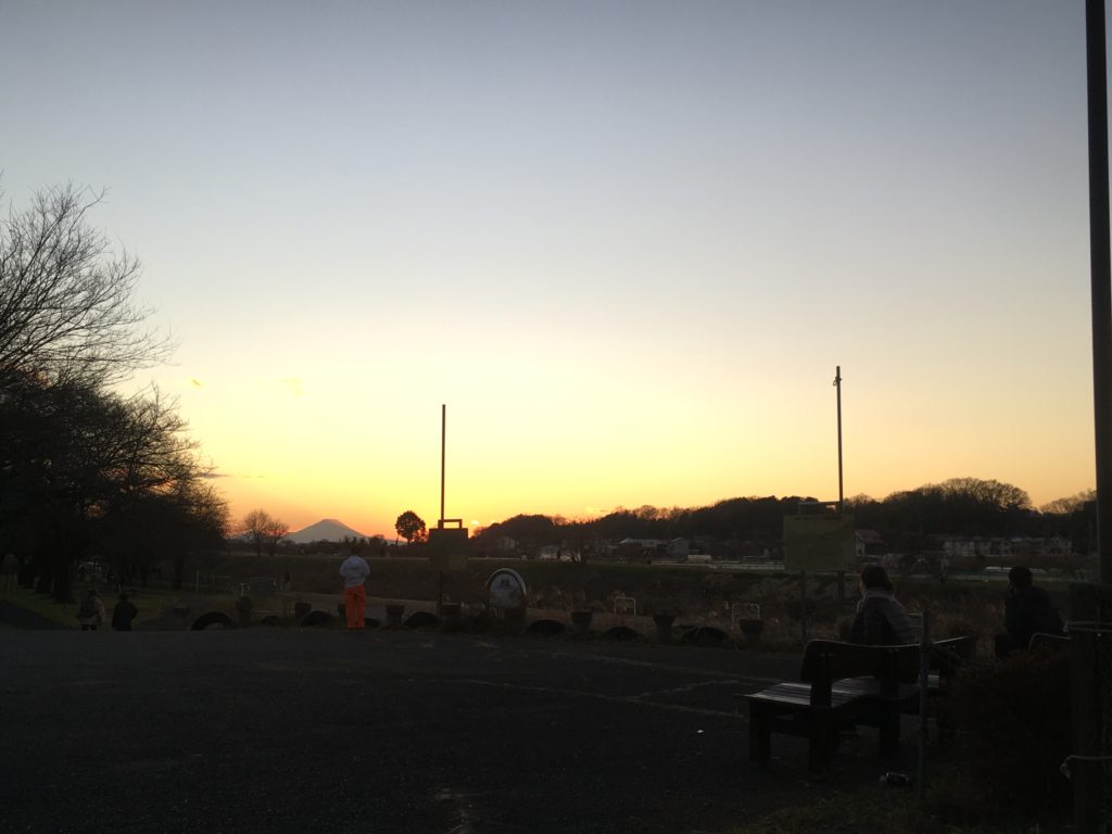 少し前、夕方たまたま通りかかったのですが、台田運動公園のほうに、こんな素晴らしい富士山ビューのスポットがあるのを発見しました。ちょうどこの時期はこの方角に日が沈むようで、夕日を観賞しているかたも何人かいらっしゃいました。