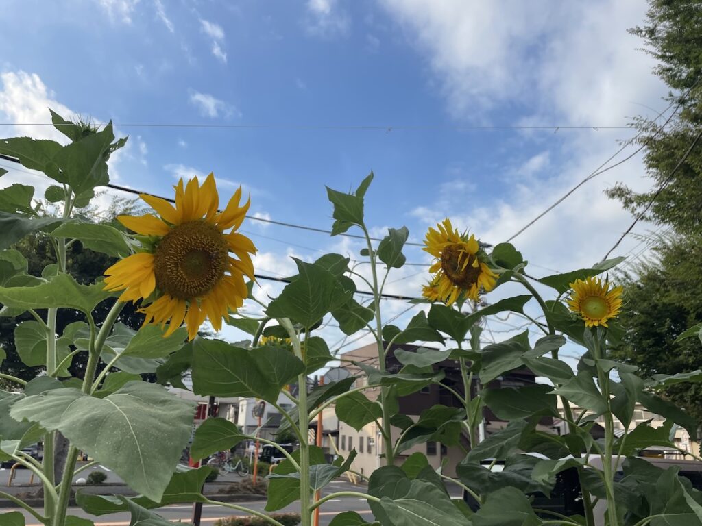清瀬ひまわりフェスティバルは終わってしまいましたが、事務所前の花壇のひまわりはいまがピークです。最近はいろいろな種類のひまわりがあって、ひと株でいくつもの花が咲く種類も人気ですが、事務所前のひまわりは、ひと株に一輪咲くタイプがメインです。大きな花が咲いてくれますが、ひまわりは意外と開花期間が短いんですよね。
